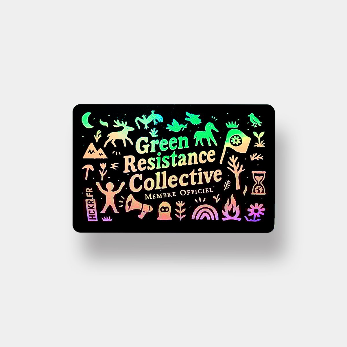 GREEN RESISTANCE COLLECTIVE est une carte NFC/QR holographique accompagnée de son étui porte-carte. Elle rassemble et donne accès à une bibliothèque militante de +500 ressources : manifestes écoradicaux, guides de sabotage, documentaires coup-de-poing, podcasts de terrain, archives des luttes et essais incendiaires.