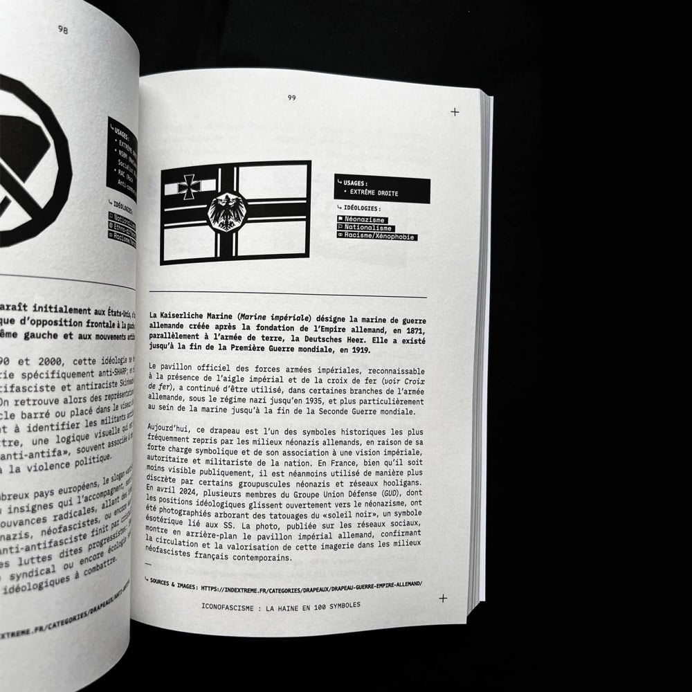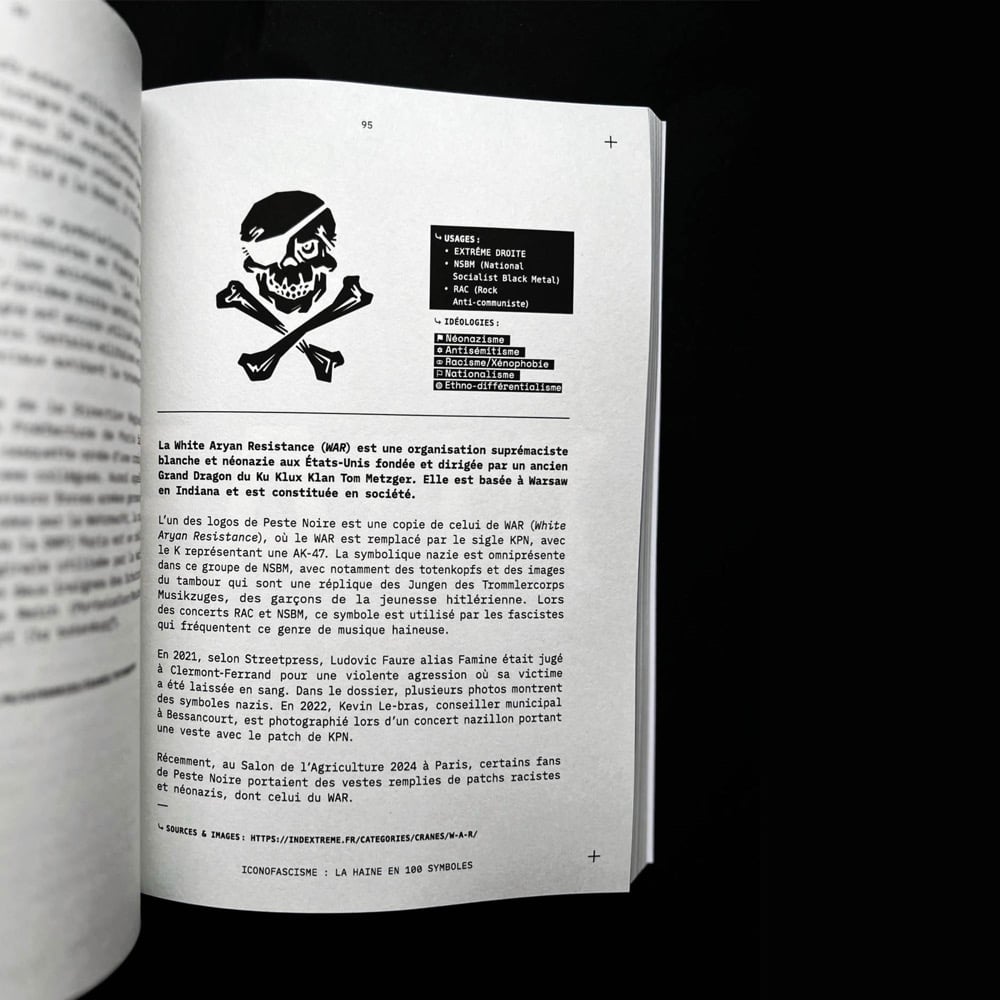 Ce livre est le fruit de deux ans de travail collectif menĂ© par moi-mĂȘme aux cĂŽtĂ©s de Ricardo Parreira et soutenu par les membres de lâassociation IndextrĂȘme. Nous avons observĂ©, collectĂ©, classĂ© et analysĂ© pour ce livre 100 symboles graphiques rĂ©appropriĂ©s par lâextrĂȘme droite française contemporaine. Acronymes, animaux, croix, runes, chiffres, emojis : chaque signe est dĂ©codĂ© pour montrer comment il fait le fruit dâune rĂ©appropriation sĂ©miotique et servir une idĂ©ologie raciste, antisĂ©mite, islamophobe, homophobe ou sexiste.